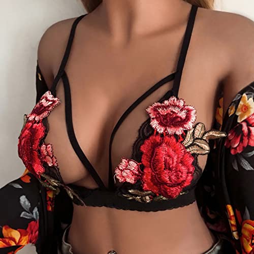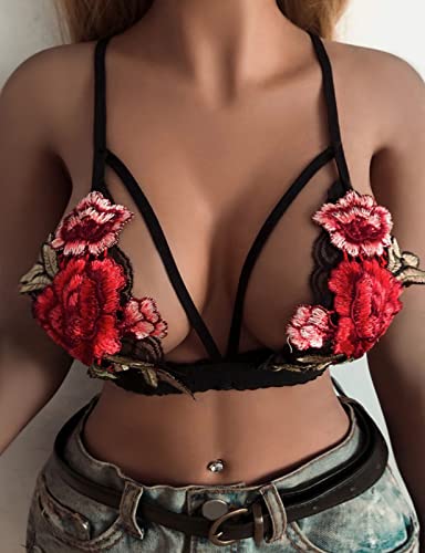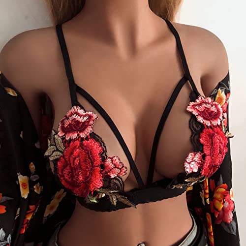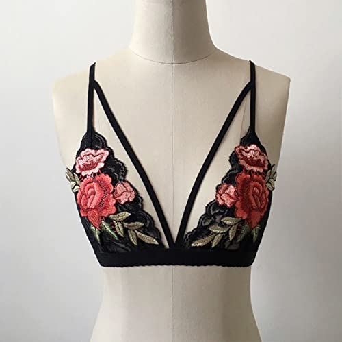 Womens Embroidered Lace V Neck Floral Crop Cami Bust Backless Bralette Lingerieset (Black, XL)