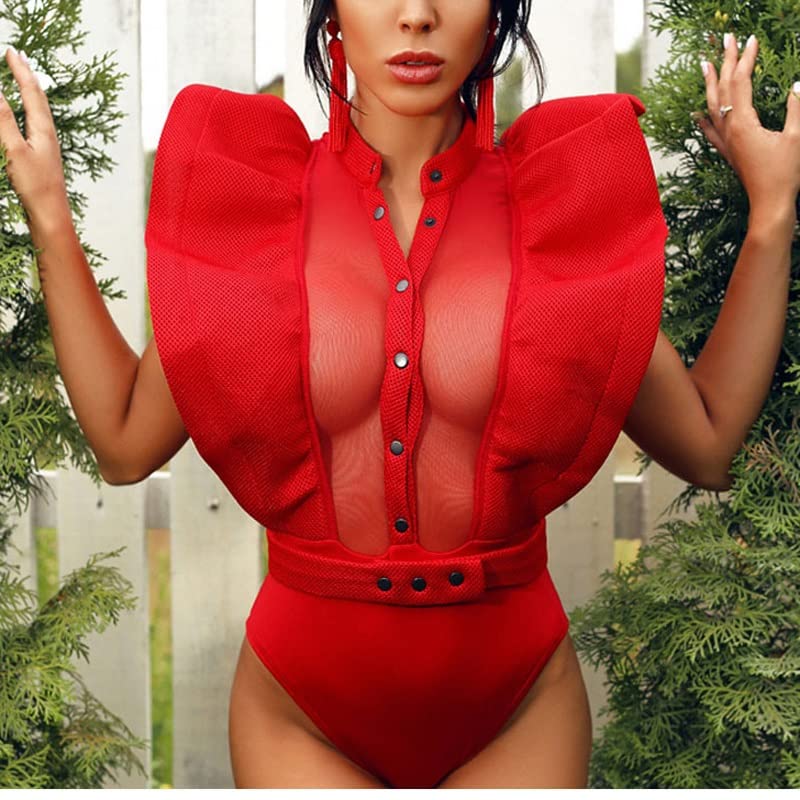 Specification: Geschenken Vintage Women’s Fly Sleeve Mesh Bodysuit met Riem Metalen Knopen Perspectief Vrouwelijk Lichaam Top Kleding Zomer (Color : Rosso, Size : S code)